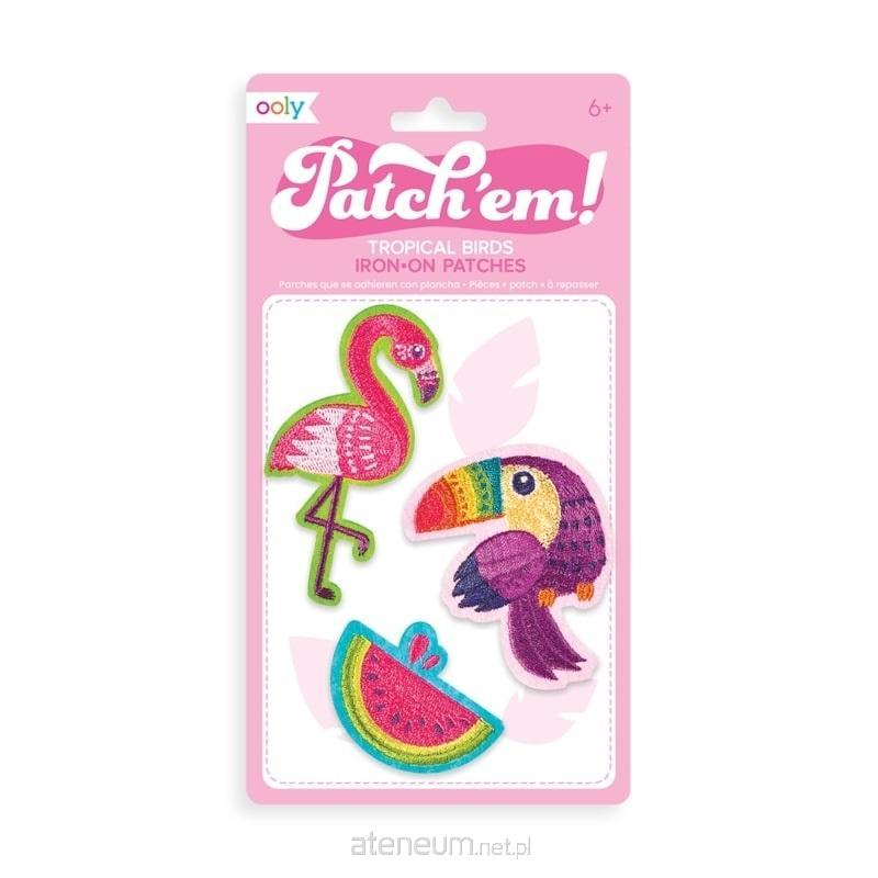 Trzy kolorowe łatki Ooly Tropikalne Ptaki, które można naprasować, nakleić bądź naszyć na ubrania, obuwie, torby, plecaki itp. akcesoria by nadać im indywidualny charakter.