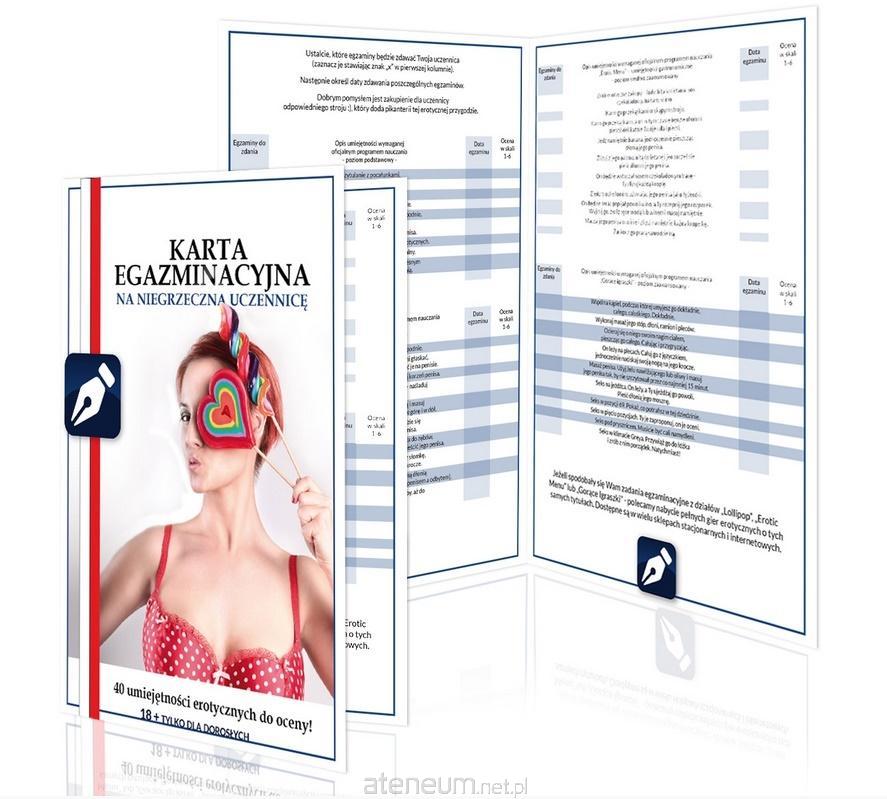 Cel gry: budowanie relacji partnerów bez tematów tabu, prosta dobra zabawa oparta o wykonywanie zadań oraz ich ocenę, zatrzymanie się i delikatne wcielenie w inną postać co pozwala na odważniejsze wykonywanie zadań Dzienniczek niegrzecznej uczennicy to erotyczna przygoda, w której partner wciela się w rolę nauczyciela, a partnerka w rolę uczennicy. Niegrzecznej uczennicy, która staje przed swoim egzaminatorem, wyposażonym w listę umiejętności wymaganych przez oficjalny program edukacji erotycznej. To nauczyciel decyduje, w jakiej kolejności będą wykonywane zadania egzaminacyjne i wystawia uczennicy odpowiednią ocenę. Jeżeli ocena będzie niska, partnerka może próbować starać się o poprawienie swojego wyniku - do czego zachęcamy. Polecamy sprezentowanie uczennicy odpowiedniego mundurka, by przygoda była jeszcze bardziej smakowita. Gadżet w skrócie: - karta egzaminacyjna na niegrzeczną uczennicę - 40 umiejętności erotycznych do oceny - wspaniała zabawa erotyczna dla par - duży format! Rozkładane A4! - uwaga! gra tylko dla dorosłych! - zrób egzamin swojej partnerce - na pewno nie pożałujesz :) Poziom pikanterii: 3/5