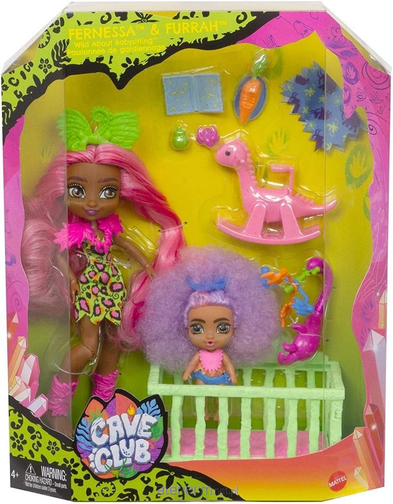 Oto Cave Club grupa niesfornych młodych jaskiniowców, którzy wyprzedzają swoją epokę! Z lalkami i zestawami do zabawy Cave Club dzieci mogą cofnąć się w czasie i przeżywać prehistoryczne przygody. Jaskiniowa opiekunka Fernessa uwielbia zajmować się maluchami, ale z Furrah ma pełne ręce roboty! W zestawie jest wszystko, czego potrzebuje, aby zaopiekować się niesforną podopieczną, w tym łóżeczko z uroczą karuzelką z motywem dinozaurów, która naprawdę się obraca wystarczy ją popchnąć. Gdy Furrah wstanie po drzemce, przyczep ją do dinozaura na biegunach i porusz, aby zobaczyć, jak się buja. Dzięki mniejszym akcesoriom dzieci mogą odgrywać różne scenki, od przekąski po bajki na dobranoc. Dwie lalki Cave Club z kolorowymi włosami i neonowymi ubrankami inspirują do wymyślania prehistorycznych przygód.