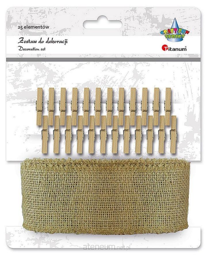 Drewniane klamerki do przypinania fotografii, karnecików przy prezentach, winietek na stół, dekorowania stroików, bukietów, doniczek, kartek okolicznościowych. Doskonałe uzupełnienie dla techniki scrapbookingu. Kolor: naturalny. Wymiar klamerki: 4x30mm. W blistrze 24 klamerki i jutowa wstążka 5cm x 2m. 25 szt.
