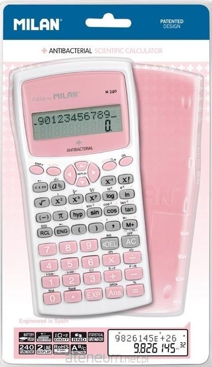 Kalkulator naukowy z antybakteryjną obudową, która pokryta jest powłoką zawierającą jony srebra, które hamują i zapobiegają rozwojowi bakterii w całym ciele. Idealne do poprawy higieny w szkole, w biurze, w środowiskach mających kontakt z żywnością i środowiskach sanitarnych. Posiada 240 zintegrowanych funkcji. 2 liniowy wyświetlacz LCD (10 + 2 cyfry). Równoczesne wyświetlanie wyrażenia matematycznego i wyniku. Biało-różowy kalkulator z wytrzymałym przezroczystym pokryciem ochronnym. Zasilanie: 2 x baterie AAA w zestawie. Zawiera instrukcje. Kalkulatory MILAN spełniają wymagania dyrektywy RoHS o ograniczeniach stosowania niektórych substancji niebezpiecznych w urządzenia elektrycznych i elektronicznych. Oryginalny projekt stworzony przez własny dział badawczo-rozwojowy MILAN. Pakowany na blistrze. Rozmiar kalkulatora: 16,7 x 8,4 x 1,9 cm. Najważniejsze dostępne funkcje: obliczenia statystyczne; rachunek 6 różnych rodzajów regresji wraz z ich współczynnikami A,B; wzajemna transformacja współrzędnych prostokątnych i biegunowych; bezpośrednie operacje na ułamkach, także sześćdziesiątkowych; funkcje trygonometryczne i odwrotne do trygonometrycznych; funkcje paraboliczne i hiperboliczne oraz im odwrotne; obliczenia z zastosowaniem jednostek kątowych w stopniach, radianach, gradach; konwersja między systemem dziesiętnym i sześćdziesiętnym; generowanie wartości losowych; obliczanie kombinacji i permutacji; notacja inżynierska; kursor do zmiany MENU; statystyka dwuwymiarowa z obliczaniem wartości średniej, szacowanej i sum; funkcje SCI/FIX/ENG.