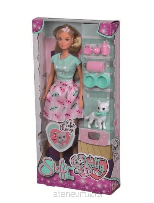 Steffi opiekuje się kotkiem, jej strój jest dopasowany do charakteru pupila. Kociak ma brudny pyszczek, można go wyczyścić pocierając namoczoną w ciepłej wodzie dołączoną ściereczką - reaguje na zmianę temperatury, dołączone akcesoria do pielęgnacji i zabawy.