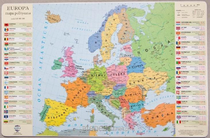 Nadruk z aktualnym podziałem politycznym, stolice państw, powierzchnie w km, liczba ludności, oznaczenie na pojazdach. Podkładka jest zabezpieczona wysokiej jakości folią z podkładem antypoślizgowym, odporna na ścieranie, kurz, wodę, wilgoć. Może służyć jako podkładka na biurko, pod mysz komputerową, pod notatnik itp.