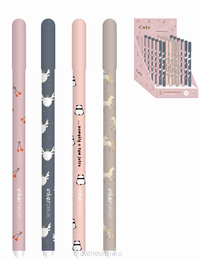 Opakowanei zbiorcze 36szt. Grubość pisania: 0,5 mm. Zamykany na skuwkę. Niebieski wkład. Zakończony gumką, która umożliwia szybką i estetyczną korektę napisanego tekstu, bez użycia korektora czy przekreślania. Obudowa w 4 słodkich, dziewczęcych wzorach. 36 szt. w displayu. Te same motywy znajdziesz również na naszych ołówkach, gumkach i akcesoriach papierniczych - stwórz swój niepowtarzalny zestaw!