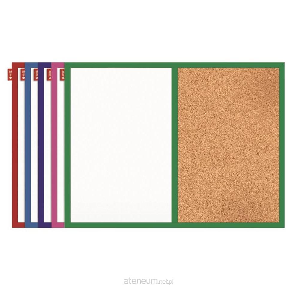 Tablica DUO o wym. 60x40 cm w ramie drewnianej, lakierowanej (MIX kolorów) o szer.16 i grub.14 mm. Powierzchnia tablicy wykonana z naturalnego materiału korkowego i ze stali lakierowanej o właściwościach suchościeralnych i magnetycznych. Tył tablicy - pilśnia. W zestawie 5 szt. pinezek beczułek i 3 szt. magnesów oraz komplet haczyków. Montaż tablicy w pionie lub w poziomie. Wzmocnienia: dodatkowe zszywki z tyłu tablicy.
