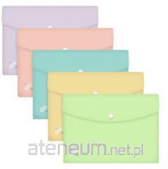 Mix w opakowaniu zbiorczym, 5 sztuk. Teczka kopertowa na zatrzask wykonana z mocnego polipropylenu o grubości 300 mic. Zamknięcie na zatrzask skutecznie chroni przed wypadaniem. Zaokraglone rogi dbaja o bezpieczeństwo zarówno biurka, wnętrza torby czy nawet ubrania.