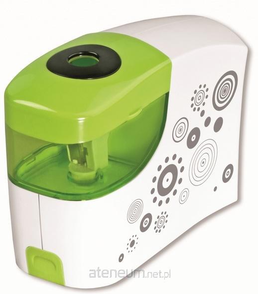 Automatyczna temperówka na baterie typu AA (4 sztuki, niedołączone do opakowania) wyposażona w dwa wymienne mechanizmy ostrzenia z otworami różnej średnicy (11 mm, 8 mm). Posiada wyjmowany pojemnik na ścinki oraz antypoślizgowy spód. Możliwość użycia bez baterii.