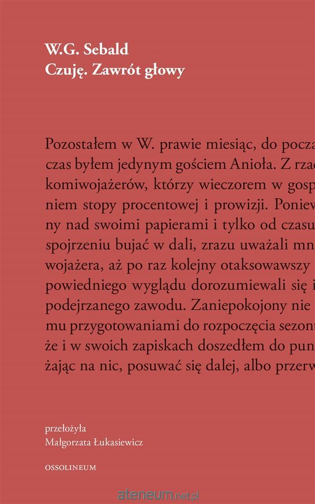 Czuję. Zawrót głowy to cztery teksty o podróży. Autor wędruje szlakiem Stendhala, sprawdza, jaki dzień wybrał Casanova na ucieczkę z więzienia, z Kafką przebywa u wód i idzie do kina, okrężnymi drogami trafia w głąb swojego dzieciństwa. Proza Sebalda kocha się w szczegółach. Warto zatrzymać uwagę na mijanym wzgórzu, na przechodniu spacerującym pod parasolem, na współpasażerach w przedziale pociągu, na kloszardach z dworca kolejowego. Literacka podróż nasączona konkretem służy zachowaniu w pamięci wydarzeń teraźniejszych i przypomnieniu minionych, zarówno z historii prywatnej sprzed kilku czy kilkunastu lat, jak i dawniejszej, wspólnej wszystkim ludziom, przekazywanej w listach i dziennikach.