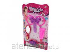 Torebka z krótkim paskiem zawierająca : 8 błyszczyków, 2 lakiery do paznokci, 4 spinki do włosów, 4 gumki do włosów, 1 separator do palców, 1 aplikator i 2 naklejki.