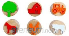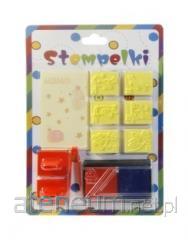 Pieczątki Minionki. W skład zestawu wchodzą: 3 drewniano-gumowe pieczątki, 1 poduszeczka do tuszu i 3 kolorowe kredki ołówkowe.