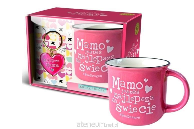 Zestaw zawierający ceramiczny kubek i brelok zapakowane w eleganckie pudełko.