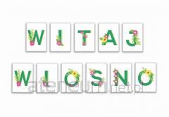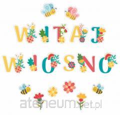 Zestaw składa się z ozdobnego napisu WIOSNA, 5 kwiatów, 2 motyli i jednej biedronki.