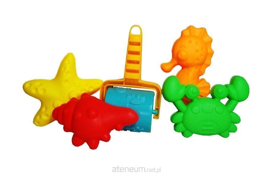Zestaw czterech foremek do piasku z motywem morskim razem z wałkiem. Zabawka odpowiednia dla dzieci w wieku powyżej pierwszego roku życia.