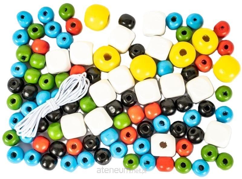Koraliki drewniane w różnych kolorach, rozmiar koralików 10 - 15 mm, w opakowaniu 100 szt. + gumka biała 1 m