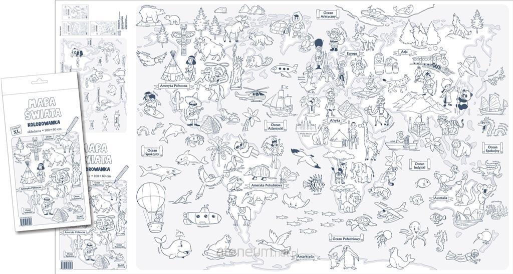 Ze składaną kolorowanką "Mapa świata" dzieci mogą wyruszyć w swoją pierwszą podróż dookoła globu. Poznają przy tym zwierzęta, rośliny, symbole i postacie charakterystyczne dla poszczególnych kontynentów. Kredki w dłoń! Ogromny, ilustrowany arkusz o wymiarach 100 x 60 cm jest do dyspozycji małego artysty.