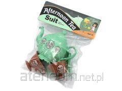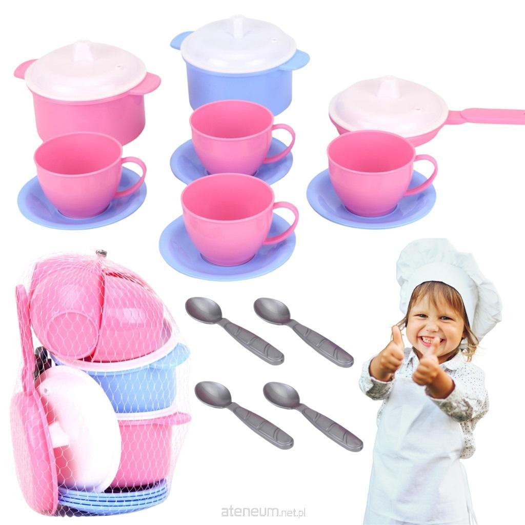 W skład zestawu wchodzą: 2 garnki i patelnie z pokrywkami, 4 kubki na talerzach, 4 łyżki.