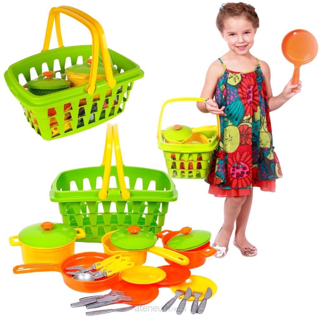 Wszystkie elementy zestawu wykonane są z mocnego, wysokiej jakości, bezwonnego tworzywa sztucznego, bezpiecznego dla dzieci. W skład zestawu wchodzą : kosz, 2 garnki z pokrywką, rondel z pokrywką, patelnia, łopatka, duży widelec, chochla, skimmer, dzbanek z pokrywką, 4 talerze z przyborami.