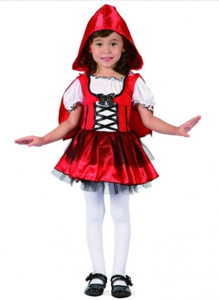 Strój dla dzieci. Zestaw zawiera sukienkę oraz pelerynkę z kapturem. Długość całkowita sukienki 52 cm Długość spódnicy (od pasa) 24 cm Długość rękawa 18 cm Szerokość pod pachami 31cm Szerokość w pasie 33 cm Sukienka w kolorze czerwono-biało-czarnym. Zdobiona wiązaniem gorsetowym oraz czarną kokardką w białe kropki. Obszyta czarnym cienkim tiulem. Rękawki pufki wykończone falbankami oraz czarną lamówką. Czerwona pelerynka wykonana z błyszczącego materiału mocowana na rzepy.
