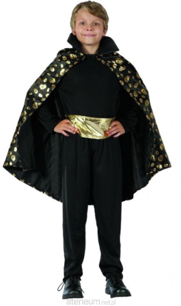 Strój dla dzieci. Zestaw zawiera pelerynę oraz pasek. Rozmiar 110/120 cm. Wymiary: dł. cał. peleryny bez kołnierza 65 cm obwód pasa 56 cm Strój małego wampirka został wykonany z wysokiej jakości elastycznego poliestru. Czarna peleryna wykończona złotymi czaszkami, zapinana na rzepy. Sztywny kaptur również w czarnym kolorze. Złoty pas idealnie utrzymuje się na biodrach.