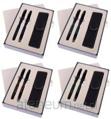 Zestaw plastikowego długopisu i ołówka automatycznego, gumowy uchwyt zapewniający wygodne trzymanie, wymienny wkład F-411 needle z igłową końcówką do bardzo cienkiego pisania, szerokość linii 0,5 mm, niebieski kolor tuszu (długopis), grafit 0,5 mm, końcówka wysuwana (ołówek automatyczny), pudełko upominkowe.