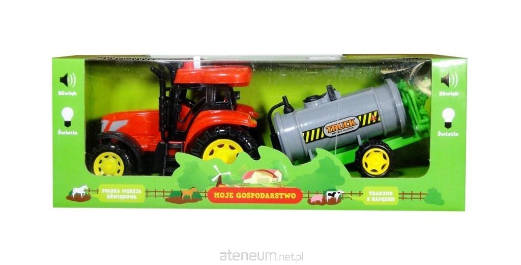 Plastikowy traktor z doczepioną przyczepą. Traktor z serii Moje Gospodarstwo z wyjątkowymi dźwiękami: odgłosami zwierząt, traktora oraz z polskimi zwrotami o tematyce typowo rolniczej. Kolejność zwrotów odpowiada kolejności wykonywania konkretnych prac.