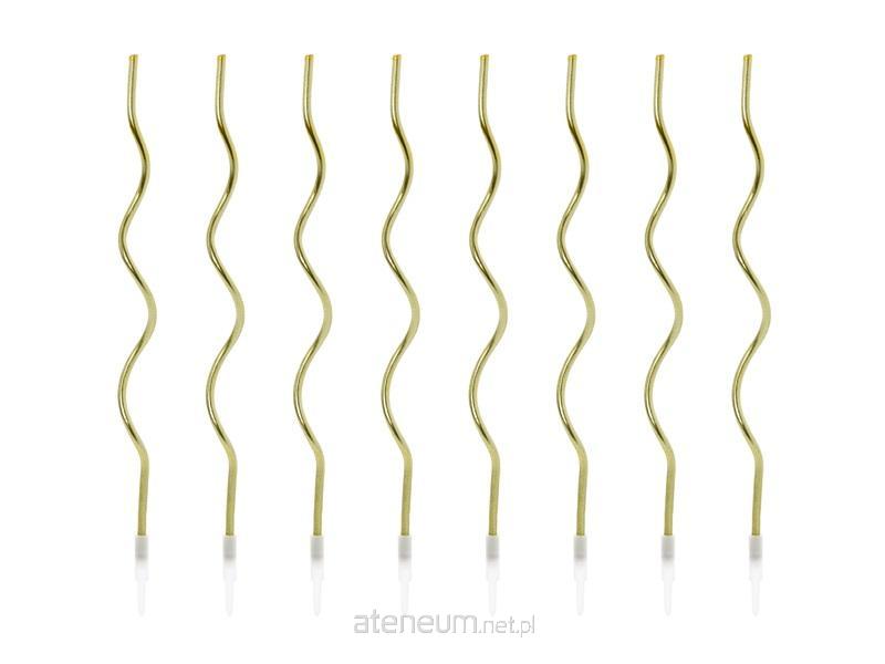 Świeczki urodzinowe zakręcone, w kolorze złotym metalizowanym, wysokość ok. 14 cm. Zestaw zawiera 8 świeczek i podstawek.(1 op. / 8 szt.)