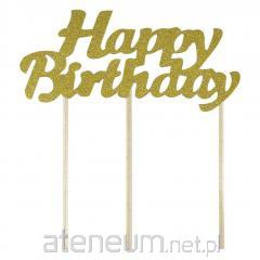 Topper na tort Happy Birthday, wykonany z papieru lustrzanego w kolorze złotym, wysokość ok. 22,5 cm.