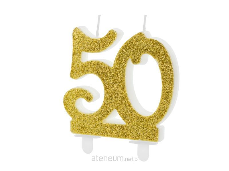 Świeczka urodzinowa liczba 50 w kolorze złotym brokatowym, rozmiar ok. 7.5 cm.