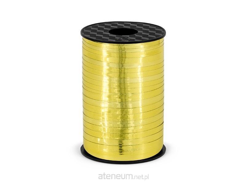 Wstążka plastikowa metalizowana w kolorze złotym, szerokość ok. 5 mm, długość ok. 225 m.