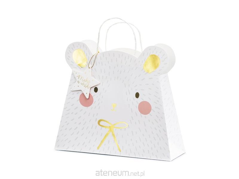 Torebka na prezenty Miś polarny w kolorze białym z kolorowym nadrukiem, wymiary bez uchwytów ok. 31.5 x 27 x 10cm.