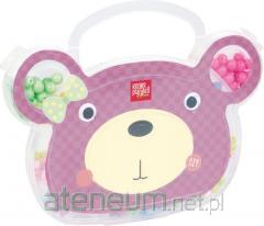 W zestawie: koraliki w różnych kształtach i kolorach, 2 sznureczki do nawlekania.