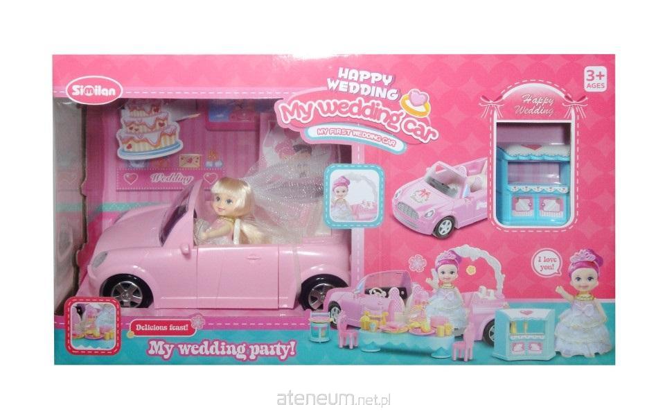 Plastikowe auto bez dachu z uroczą laleczką w sukni ślubnej w środku. Samochód można rozłożyć i urządzić przyjęcie ponieważ w zestawie znajdują się takie akcesoria jak: stół, tort, prezenty, krzesła, sztućce. Produkt zapakowany w kartonowe opakowanie.