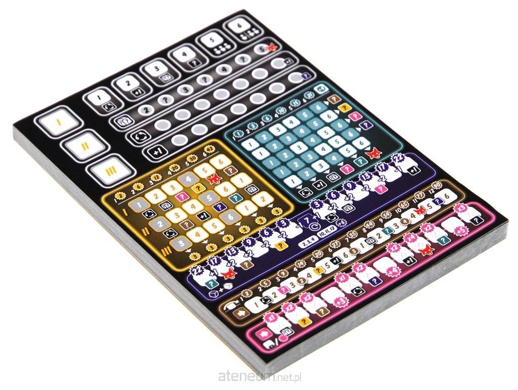 Bloczek do gry kościanej Kości zostały rzucone, który jest prawdziwym wyzwaniem! Nowe kombinacje wymagają nowych strategii. Bloczek składa się z dwustronnych kartek. Jedna strona przeznaczona jest do wykreślania wyników wskazanych przez wyrzucone kości, druga strona służy do podliczenia ostatecznych rezultatów. ZAWARTOŚĆ: bloczek (wyzwanie) do gry "Kości zostały rzucone".