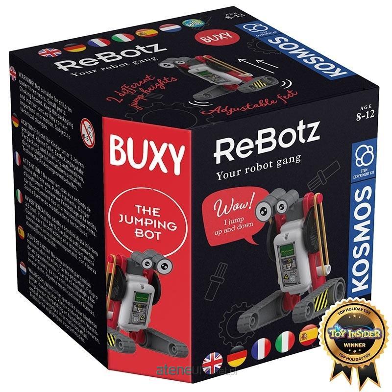 Niesamowite, jak ten mały robot skacze dziko po pokoju i zaskakuje wszystkich swoimi brawurowymi sztuczkami! Wyposażony w gumkę i silnik, dziki Buxy jest nie do powstrzymania! Dzieci w wieku od 8 do 12 lat szybko łączą ze sobą poszczególne części, wkładają silnik i umieszczają baterie w komorze - jasne instrukcje podpowiadają, jak to zrobić. Możliwe są zabawne eksperymenty z różnymi wysokościami skoku! Ale robi się jeszcze zabawniej, gdy części ciała Skaczącego Robota zostaną zamienione z częściami jego trzech przyjaciół! Gang robotów z KOSMOS - 4 boty ze złomowiska, które tchną nowe życie w stare części, z których są zrobione. Z fajnymi naklejkami, które sprawiają, że ReBotz wygląda jeszcze bardziej szalenie!