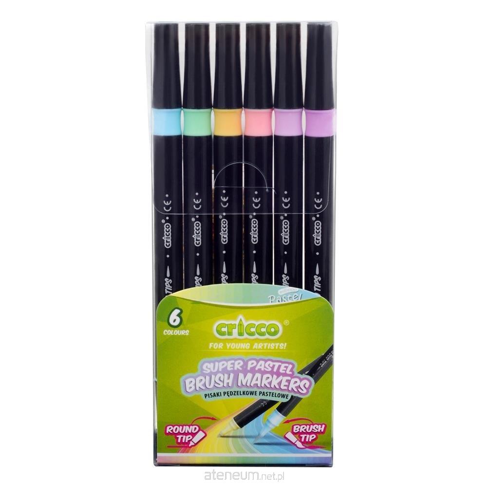 Dwustronne pisaki Cricco z jedną cienką końcówką w formie flamastra oraz drugą, miękką, pędzelkową końcówką. Z syntetycznego włosia, umożliwiającego przyjemne i precyzyjne kolorowanie. Pastelowe, delikatne kolory doskonale nadają się do dekoracji na różnych powierzchniach. Zestaw 6 kolorów w praktycznym, plastikowym etui.