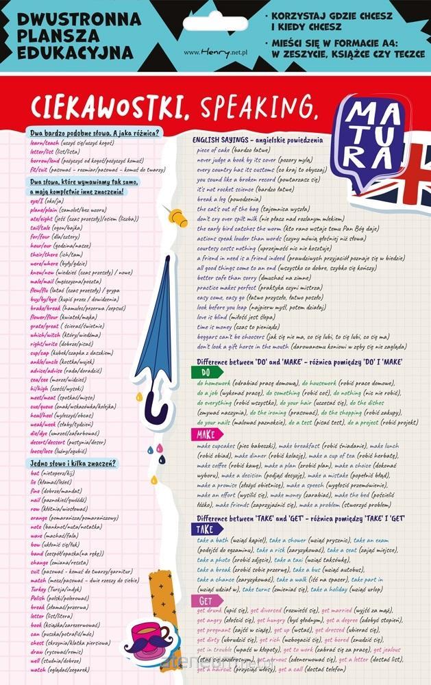 Dwustronna plansza/ściągi, wydrukowany na grubym papierze kredowym, dodatkowo pokryty folią błyszczącą. Rogi planszy są zaokrąglone.