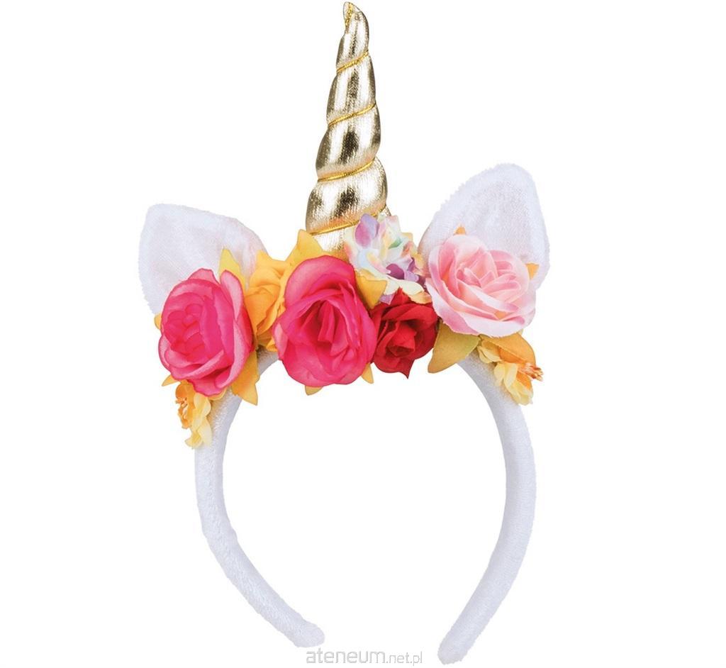 OPASKA UNICORN Z RÓŻAMI Długość rogu: 11 cm Długość uszu: 7 cm Ilość sztuk w opakowaniu: 1 Opaska w kolorze białym ze złotym rogiem Jednorożca i kolorowymi różyczkami.
