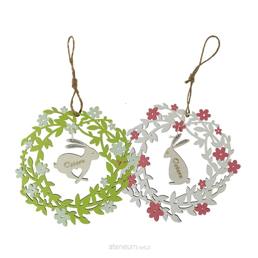 Drewniana dekoracja wielkanocna z zajączkiem - dostępna w dwóch wersjach kolorystycznych: zielonej i różowej wysyłanych losowo. Produkt certyfikowany FSC.