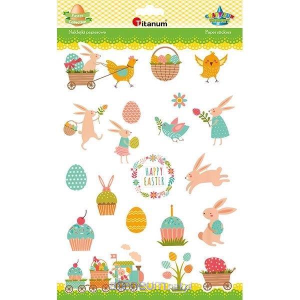 Naklejki papierowe: króliczki, pisanki, koszyczki, pociąg, napis "Happy Easter", 20 szt.