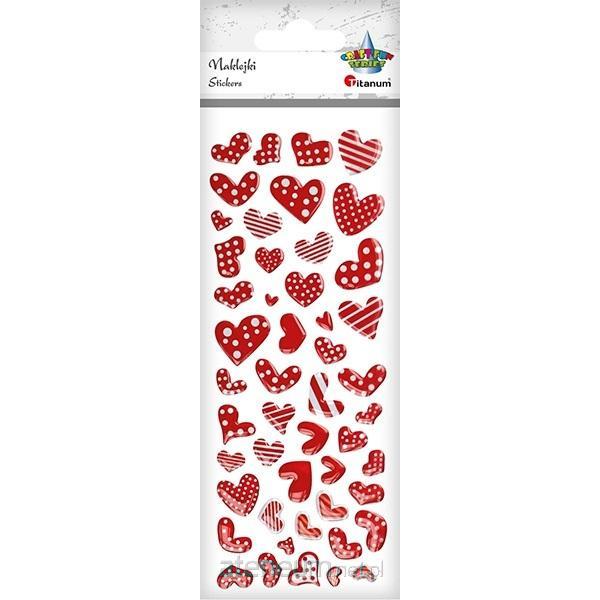Naklejki foliowe: serca. Mix rozmiarów, czerwone w białe groszki i paski, 49 szt.