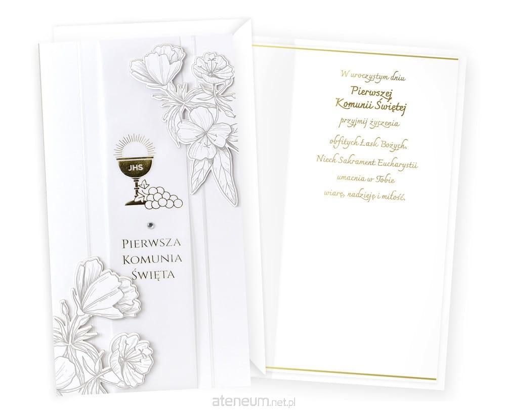 Każda kartka w kolekcji Passion Moments to małe arcydzieło - wyjątkowe i niepowtarzalne, piękne wizualnie. Kartki PM są bardzo bogato zdobione, a jednocześnie skromne i stylowe, cały efekt tkwi w detalach i doskonałym wykonaniu. W zależności od wzoru, na kartkach znajdują się dekoracje ze złotej, srebrnej, perłowej lub holograficznej folii, a także doklejki biżuteryjne, kokardki, brokat, laserowe wycięcia, wstążeczki i inne dodatki. Wnętrze karnetu to zawsze atrakcyjna grafika i tekst życzeń. Kartki mają w komplecie dopasowaną kopertę. Cechy szczególne: zdobienie: przynajmniej dwie folie (metaliczne/perłowe/holograficzne), brokat, elementy doklejane, wycięcia laserowe, wstążeczki - w zależności od wzoru, wnętrze: z delikatną grafiką, wyjątkowe życzenia w środku, w komplecie: dopasowana kolorystycznie koperta, okazja: komunia Wymiary karnetu po złożeniu: 11,4 x 21,5 cm.