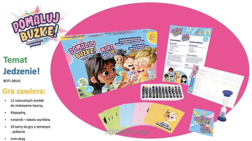 W zestawie jest 12 naturalnych kredek do malowania twarzy, klepsydra, notatnik - tabela wyników, 24 karty do gry: tematyka jedzenie.