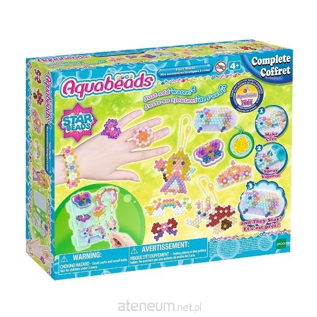 Magiczny bajkowy świat Aquabeads. Stwórz bajkowe kreacje z niesamowitych koralików Aquabeads ułóż wróżkę, jednorożca, tęczę i wiele innych. Stosując zawarte w zestawie elementy do tworzenia biżuterii wykonasz także piękne pierścionki, spinki do włosów, bransoletkę lub broszkę. Po wyschnięciu koralikowe obrazki można przymocować do nowej tablicy dekoracyjnej i stworzyć wspaniałą ozdobę do pokoju dziecięcego. Zestaw zawiera też zawieszki, za pomocą których wykonane figurki można przyczepić do torebki lub kluczy. Wspaniały zestaw dla kreatywnych bajkowych księżniczek: Aquabeads łączą się ze sobą w magiczny sposób, wystarczy tylko spryskać je wodą. Bez prasowania czy klejenia. Bajkowy świat Aquabeads zawiera ponad 800 kolorowych koralików (koraliki gwiazdki, brokatowe i zwykłe), podkładkę do układania, spryskiwacz, podkładkę dekoracyjną do wykonanych figurek, elementy do tworzenia spinek do włosów, pierścionków, bransoletki i broszki oraz zawieszki do kluczy. Produkt przeznaczony dla dzieci od 4 roku życia.