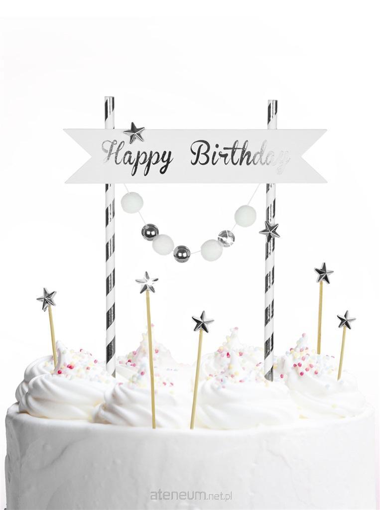 Dekoracja tortu Happy Birthday - pomponiki, 1 komplet w srebrnym kolorze