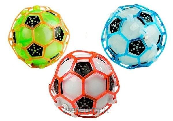 Tańcząca piłka Prezentujemy piłkę, która posiada niecodzienne, zaskakujące funkcje. Kulka przypominająca swym wyglądem piłkę futbolową wydaje rewelacyjne dźwięki, czemu towarzyszą błyskające, kolorowe światełka. To nie wszystko! Piłka skacze, odbijając się na boki, co przypomina wesoły, trudny do przewidzenia taniec. Wymienione funkcje piłki czynią ją rewelacyjną zabawką, która zaciekawi każde dziecko. Wielokolorowe światełka LED, umieszczone w środku piłki, tworzą fantastyczne iluminacje świetlne, skacząc do góry i w dół. Kulka może służyć do wielu zabaw - ich zasady ogranicza tylko bezpieczeństwo i wyobraźnia. By dziecko mogło czerpać z zabawy jak najwięcej, należy zasilić ją bateriami. By to zrobić, wystarczy rozłożyć piłeczkę na pół, a następnie umieścić baterie w przeznaczonym do tego miejscu. Składając ją, warto zwrócić uwagę na strzałki podpowiadające miejsce styku. By piłka zaczęła podskakiwać i świecić, można delikatnie rzucić ją na podłogę, bądź wcisnąć wystający przycisk. Interaktywna piłka zapakowana jest w foliową torebeczkę. Jej konstrukcja jest bardzo lekka, co gwarantuje komfortową zabawę. Piłka zasilana jest 4 sztukami baterii AA 1,5 V, które nie są dołączone do zestawu. Zabawka przeznaczona jest dla wszystkich dzieci powyżej 3. roku życia, posiada certyfikat CE, będący gwarancją spełnienia dyrektyw Unii Europejskiej, natomiast jej wyrób jest zgodny z normą EN 71. Wymiary zabawki: 12 cm x 12 cm