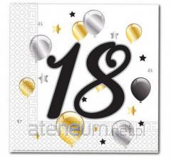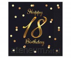 SERWETKI PAPIEROWE 18 URODZINY Wymiary: 33 x 33 cm Kolor: Czarny Nadruk:18th Birthday gwiazdki, konfetti Materiał: papier Ilość sztuk w opakowaniu: 20
