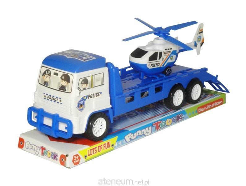 Zabawka ciężarówka policyjna z przyczepą. Na przyczepie przewożony jest helikopter. Produkt dla dzieci od 3 lat. Zabawka zapakowana w kartonową podstawkę z przezroczystym kloszem. Podane wymiary są wymiarami produktu w opakowaniu.