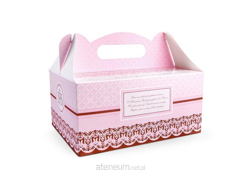 Ozdobne pudełka na ciasto komunijne z papieru z różowym nadrukiem i wierszykiem, wymiary pudełka po złożeniu 19x14x9 centymetrów.(1 op. / 10 szt.)