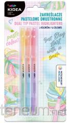 Zakreślacze o ergonomicznym trójkątnym kształcie, ze ściętą końcówką. Wyposażone w bezpieczną wentylowaną skuwkę. Nietoksyczny atrament, na bazie wody. Grubość linii pisania 1-4 mm. Zestaw zawiera 4 kolory w praktycznym plastikowym etui.
