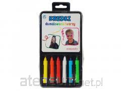 Kredki przeznaczone do malowania twarzy i ciała. Łatwo się rozprowadzają. Trwałe - pozostają na skórze nawet w trakcie aktywnej zabawy i nie rozmazują się. W łatwy sposób usuwają się pod wpływem wody z mydłem lub mleczka kosmetycznego. Zestaw zawiera: kredki 12 kolorów, brokat sypki oraz pędzelek.
